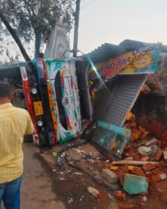 गिरिडीह। मंगलवार देर रात महेशमुंडा चौक के पास उस समय अफरातफरी मच गई जब गिरिडीह–जामताड़ा मुख्य सड़क पर तेज रफ़्तार से आ रहा बालू लदा ट्रक अचानक तीखे मोड़ पर अनियंत्रित होकर पलट गया। ट्रक सीधे बैंक ऑफ इंडिया के समीप पलटते हुए सड़क किनारे बनी लगभग आधा दर्जन दुकानों पर जा चढ़ा, जिससे सभी दुकानों को भारी नुकसान हुआ।