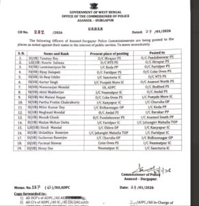 इस संबंध में पश्चिम बंगाल सरकार के गृह विभाग के अंतर्गत आसनसोल-दुर्गापुर पुलिस कमिश्नरेट द्वारा आदेश संख्या 282/2026, दिनांक 27 जनवरी 2026 को जारी किया गया है। आदेश में स्पष्ट किया गया है कि यह तबादला जनहित एवं प्रशासनिक आवश्यकताओं को ध्यान में रखते हुए किया गया है और इसे तत्काल प्रभाव से लागू किया गया है।
